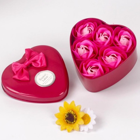 2018 Regalo de San Valentín 6 Mini Rosas Flor de jabón en caja de lata en forma de corazón